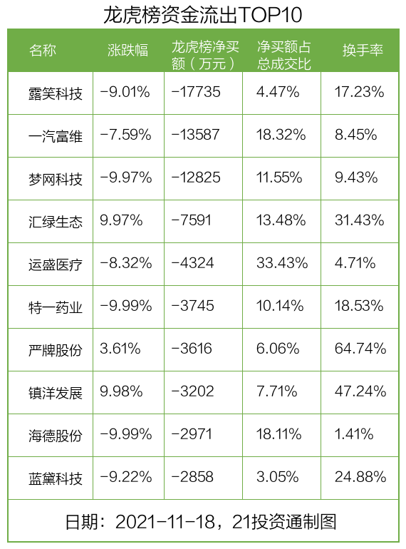 而龙虎榜中资金净流出最多的是露笑科技(002617.SZ),被净卖出为1.77亿元,占总成交金额的4.47%。露笑科技收盘下跌9.01%,换手率为17.23%。