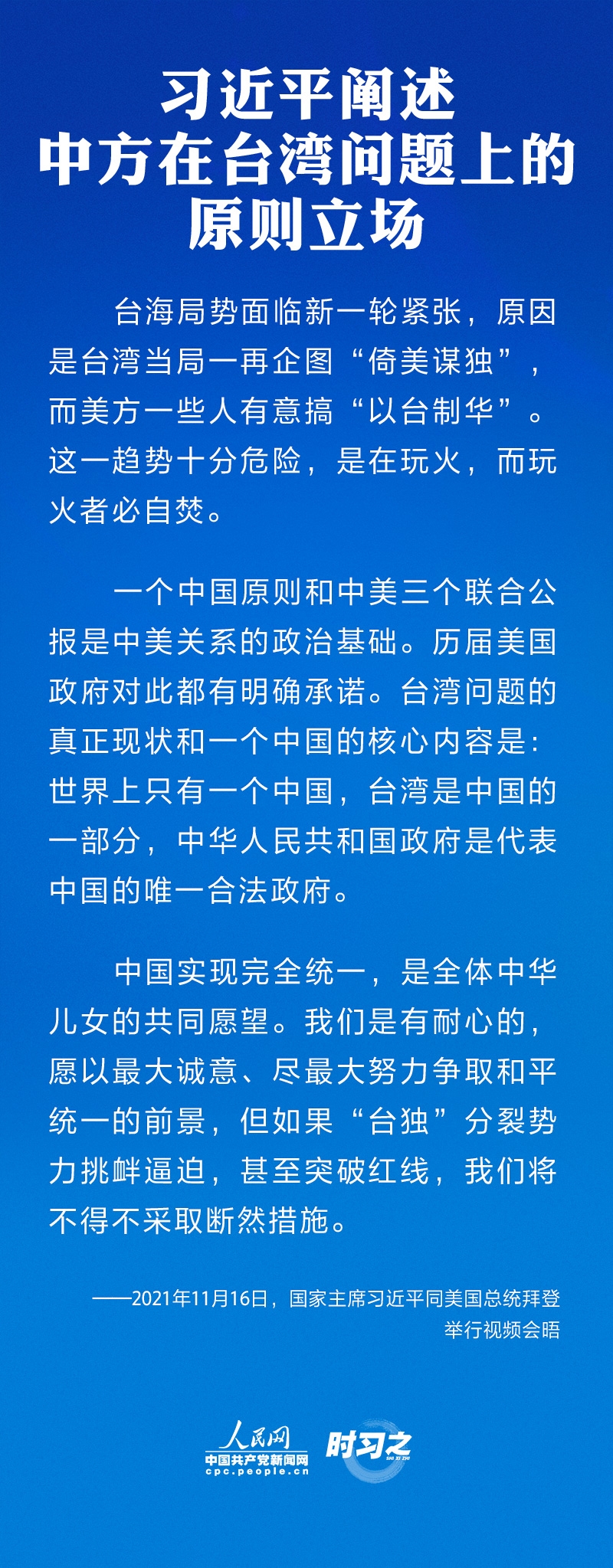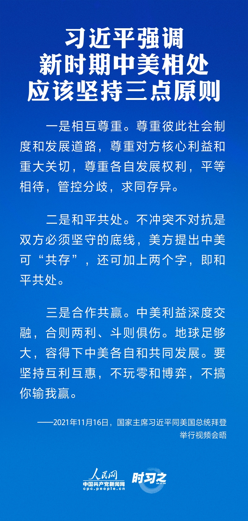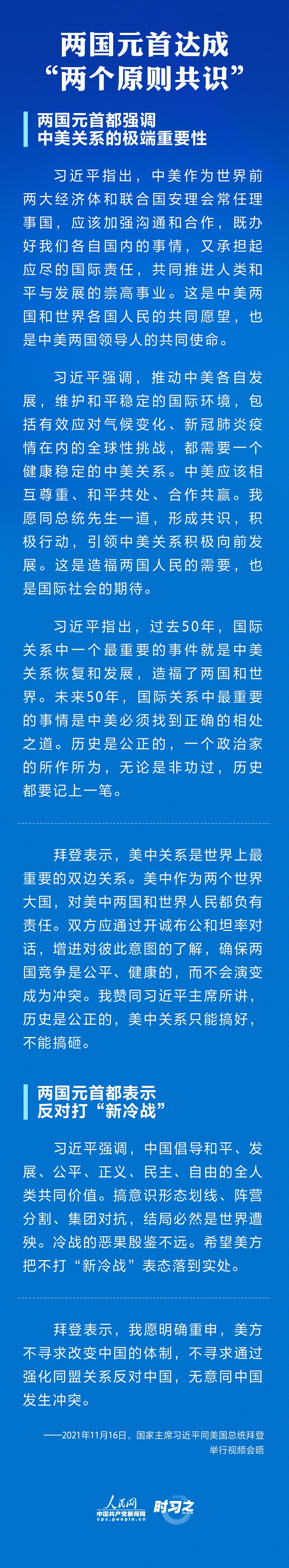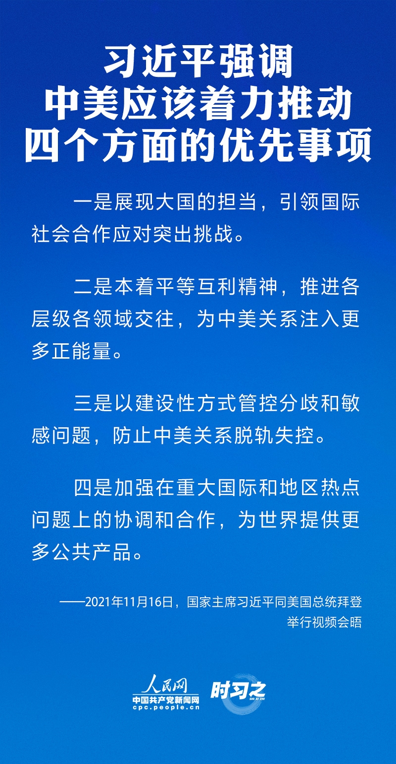 11月16日上午,国家主席习近平同美国总统拜登举行视频会晤。双方就事关中美关系发展的战略性、全局性、根本性问题以及共同关心的重要问题进行了充分、深入的沟通和交流。习近平强调新时期中美相处应该坚持三点原则、中美应该着力推动四个方面的优先事项,并阐述了中方在台湾问题上的原则立场。
