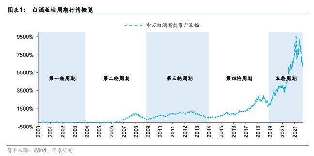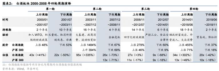 2000-2018 年白酒行业共经历四轮完整周期,分别为 2000-2003 年、2004-2008 年、2009-2013 年、2014-2018 年,本轮周期始于 2019 年。