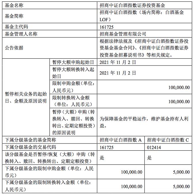 值得注意的有,10月29日晚间,招商中证白酒指数基金(LOF)发布了一则限购公告,该基金将于11月2日起暂停大额申购(含定期定额投资)和转换转入业务。其中,A类份额申购上限为10万元,C类份额申购上限为5000元。