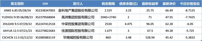 11月18日,由金科股份发行的JINKE 6.85 05/28/24现价66.49,下跌-8.7125%,收益率25.75%。此前11月16日,金科股份发布关于对控股子公司提供担保的进展公告。公告显示,金科股份为3家控股子公司提供连带责任担保,合计担保金额约15.83亿元。上述3家公司分别为天津滨奥置业有限公司、济南俊通房地产开发有限公司及南京常俊房地产开发有限公司。其中,天津滨奥接受约2.48亿元借款,总期限不超过24个月;济南俊通接受11亿元贷款,期限3年;南京常俊接受约2.35亿元的投资款项,期限不超过24个月。