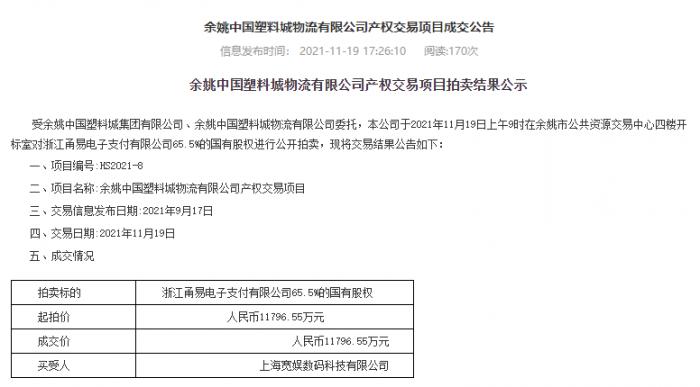 21世纪经济报道记者注意到,宁波市公共资源交易中心在其官网发布的一则交易成交公告显示,19日上午,浙江甬易电子支付有限公司(下称“甬易支付”)65.5%的国有股权以11796.55万元的价格成交,转让方为余姚中国塑料城集团有限公司和余姚中国塑料城物流有限公司,买受人为上海宽娱数码科技有限公司(下称“上海宽娱”)。