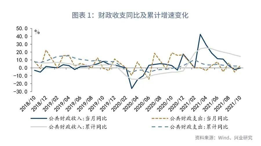 2021年10月,全国一般公共预算收入当月同比增速-0.1%,前值-2.1%,两年平均同比增速1.4%,前值1.2%;财政支出当月同比增速2.9%,前值-5.3%,两年平均同比增速10.7%,前值-3.2%。全国税收收入当月同比增速-2.2%,前值4.1%,两年平均同比增速4.2%,前值6.1%;非税收收入当月同比增速24.7%,前值-20.5%,两年平均同比增速-17.2%,前值-13.1%。政府性基金收入当月同比增速-13.4%,前值-10.4%,两年平均同比增速-4.4%,前值1.0%;政府性基金支出当月同比增速-8.4%,前值-15.1%,两年平均同比增速-0.7%,前值16.1%。