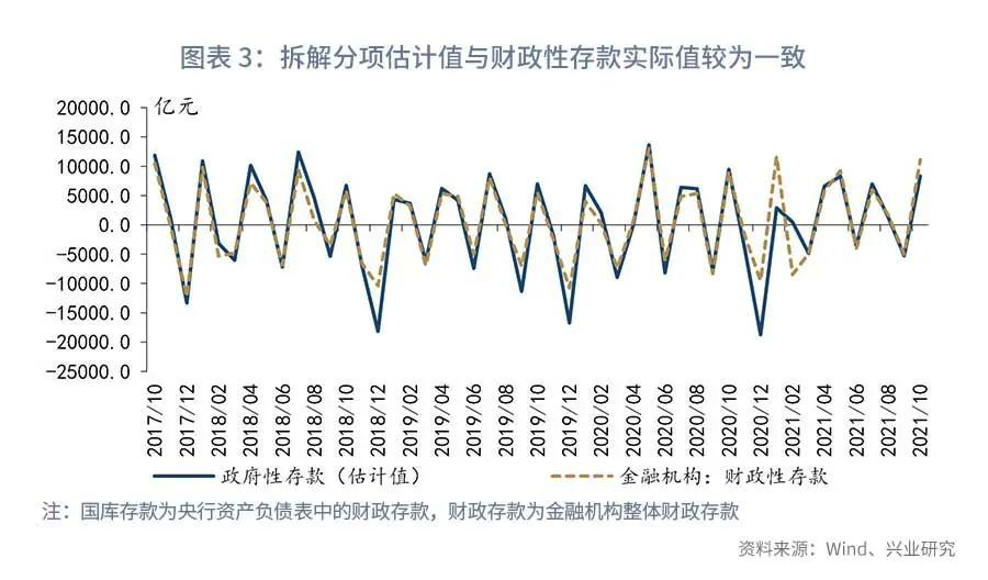 综合来看,11-12月财政性存款估计值约为-1.8万亿元,基于历史经验,若假设修正资金缺口值约为7000亿元,则结合估计值与修正值后, 11-12月最终估计财政净投放规模约为1.1万亿元,与历史同期规模较为一致。其中,资金缺口值主要来自于12月部分支出为盘活存量财政资金,且该部分资金不计入财政性存款口径,从而在12月其实际值与估计值有较大差异。若参考历史经验加上一定的缺口值,通常在6000-9000亿之间,由于今年财政收支缺口较历年较小,实际盘活存量资金或偏小,假设12月为较小缺口值7000亿元,则11月、12月最终估计财政净投放规模分别约为-2200亿元、1.3万亿元,12月投放规模较历史同期偏高。