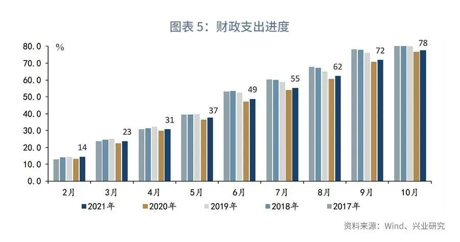 第一,11-12月一般公共预算收支差额合计约-3.0万亿元,月度分别为-0.7、-2.3万亿元。2021年10月,在收入端,收入进度92%,高于历史同期约3-4个百分点,累计收入18.1万亿元。由于前期财政收入较好,全年预算收入目标大概率超额完成。假设全年公共预算收入执行率为105%,则11-12月一般公共预算收入合计为2.6万亿元,11、12月分别为1.2、1.4万亿元。在支出端,支出进度为78%,仍低于2017-2019年同期进度,但较2020年稍有加快,累计支出19.4万亿元。从当前支出安排节奏来看,预算执行率略低,考虑年底预算支出投向除特殊疫情影响外不会有较大波动,且年底突击花钱的管理也愈加严格,因而仍假设支出端预算执行率为100%,则预计11-12月一般公共预算支出合计为5.6万亿元,11、12月分别为1.9、3.7万亿元。