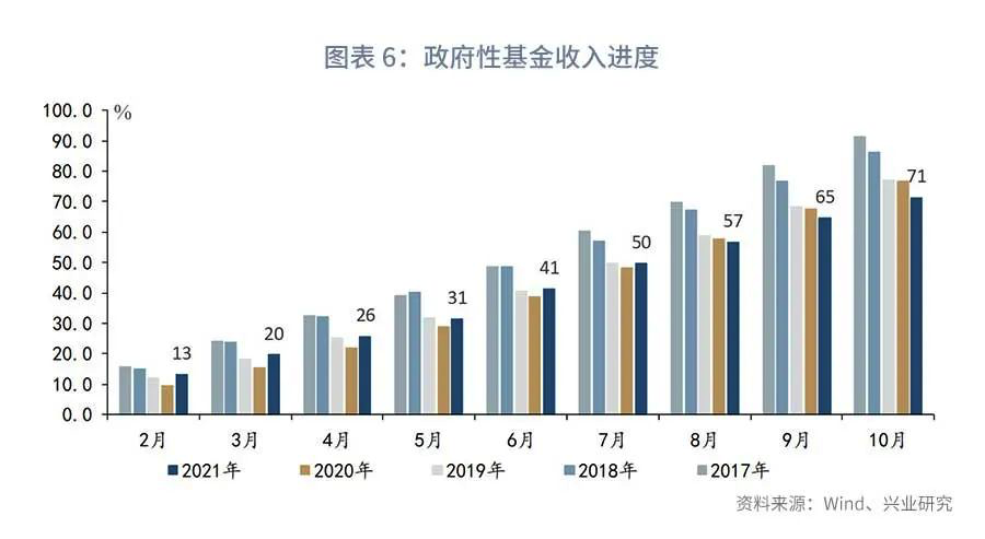 第二,11-12月政府性基金收支差额合计约-0.8万亿元,月度分别为-0.2、-0.6万亿元。2021年10月,在收入端,收入进度71%,低于历史同期,累计收入6.8万亿元。从历史情况看,通常预算执行率会超出预算10-30个百分点,政府性基金预算执行受土地市场波动及监管政策影响较大。假设全年政府性基金预算收入执行率较历史偏低,为105%,则11-12月政府性基金预算收入合计为3.2万亿元,11、12月分别为1.0、2.2万亿元。在支出端,支出进度为60%,受专项债发行节奏及资金使用监管的影响,较历史同期慢1-2个月,累计支出7.8万亿元。从当前专项债发行节奏及加快形成实务工作量的要求来看,即使后两个月进度会加快,整体较2020年仍较低,部分实物量将在2021年年初显现。假设全年预算执行率为90%,则预计11-12月政府性基金公共预算支出合计为 4.0万亿元,11、12月分别为1.2、2.8万亿元。