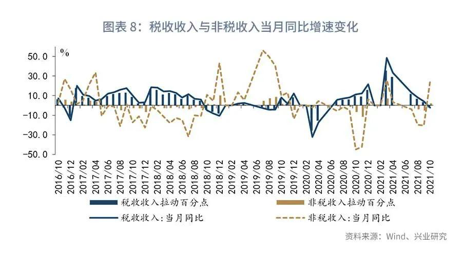 2021年10月,财政收入当月同比增速为-0.1%,前值-2.1%,较上月降幅收窄,两年平均同比增速1.4%,前值1.2%,主要原因在于非税收入对财政收入的补充。其中,税收收入当月同比增速由正转负,录得-2.2%,较上月下降6.3%,拉动-2.1个百分点,两年平均增速减小了1.9个百分点,录得4.2%;非税收收入当月同比增速较上月显著上升,录得24.7%,拉动1.9个百分点,两年平均增速同比下降至-17.2%,前值-13.1%。可见,税收收入受同比基数抬升及经济承压的影响而出现下滑下滑,预计后续全国财政收入增速继续承压。为稳定财政收入,非税收入对财政支出进行补充。