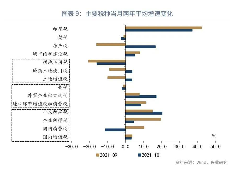 在税种结构方面,从两年平均增速来看,10月主要税种中个人所得税略有上升,企业所得税显著降低,增值税较为稳定。在直接税方面,个税当月同比增速16.9%,前值10.2%,两年平均增速增长了5.3个百分点,录得20.2%。企业所得税当月同比增速由正转负,录得-5.8%,两年平均增速为4.4%,较上月有所下降。与上月预期一致,由于制造业企业研发费用加计扣除提高比例及提前享受,企业所得税增速承压。