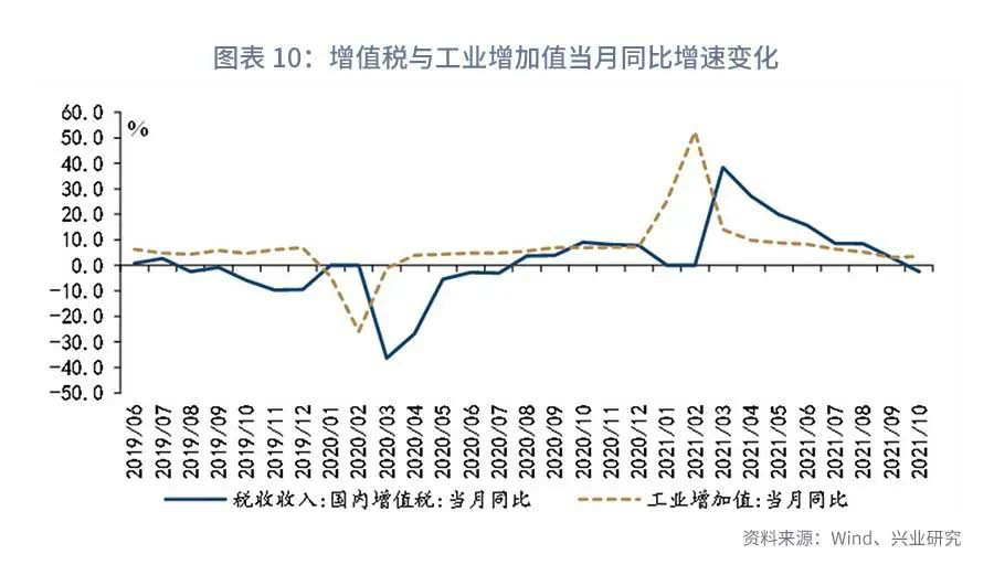 在间接税方面,增值税当月同比增速为15.7%,较上月有所上升,两年平均增速为3.1%,较上月有所下降。消费税增速当月同比由正转负,录得-7.0%,两年平均增速-11.2%,两年平均增速下降了24.7个百分点。由于消费税征收环节大部分在生产环节,因此10月消费税的下行或进一步预示生产环节应税消费品,如汽车、石油及制品类、烟酒等增速下降