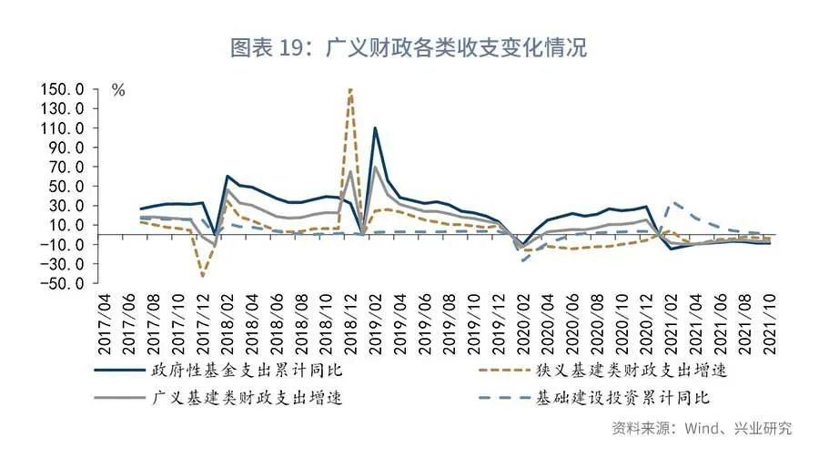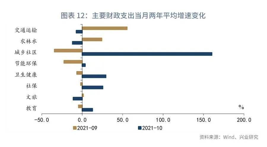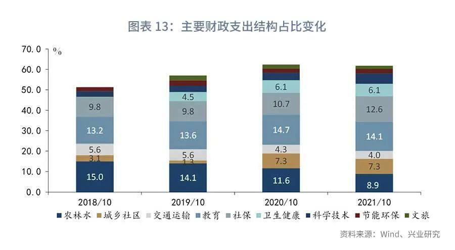 从财政资金投向看,10月支出中民生类支出大幅上升,基建类支出整体下降。与民生相关的支出中,受10月多地疫情的显著影响,社保支出两年平均增速较上月显著上升,录得25.4%,卫生支出两年平均增速大幅上升,录得29.2%,教育支出两年平均增速由负转正,录得12.7%。与基建相关的支出总体下降,其中,农林水支出增速下降至-11.9%,交通运输较上月显著下降,录得-7.3%,但城乡社区支出增速上升至160.2%,与低基数及之前相关支出安排偏低有关。从财政资金支出各项占比看,10月基建类支出占总体支出比重下降至20.1%,较上月有所下降,仍体现基建类支出的内部结构性调整。