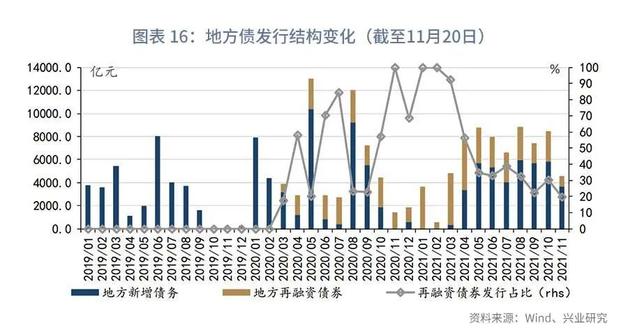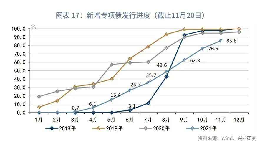 从地方债发行情况来看, 10月新增地方债5836亿元,略高于9月,其中,新增一般债701亿元,专项债5135亿元,节奏略有加快。截至11月20日,剩余约3500亿元将在后续11月及12月发行完毕。2021年新增专项债额度3.65万亿元,加上2020年末结转额度约1494亿元,截至2021年10月末,全国地方已发行新增债券36624亿元,其中一般债券7552亿元、专项债券29072亿元(此数据包含新增中小银行专项债),新增专项债发行进度为76.5%,发行进度有一定提升。此前财政部在前三季度财政收支情况新闻发布会中提到,要求地方按照“资金跟着项目走”的原则, 2021年新增专项债券额度尽量在11月底前发行完毕。从目前11月的发行节奏来看,截至11月20日,当月新增专项债3519亿元,发行进度已达85.8%,考虑到已下达额度低于预算,且新增中小银行资本金补充专项债大部分使用2020年末下达额度,则剩余新增专项债约发行3500亿元。