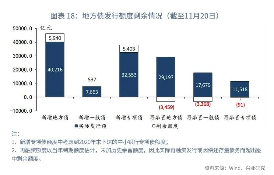 从地方债发行情况来看, 10月新增地方债5836亿元,略高于9月,其中,新增一般债701亿元,专项债5135亿元。截至11月20日,剩余约3500亿元将在后续11月及12月发行完毕,整体发行节奏与预期较为一致。