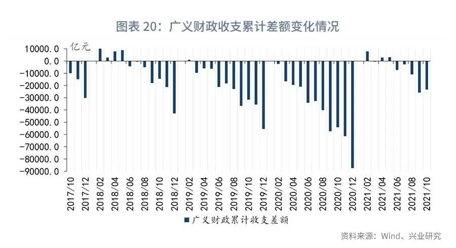 截至2021年10月,一般公共预算表现为收入进度超预期,支出进度略低;政府性基金预算表现为收入进度超预算,支出进度远低于预期;专项债发行进度整体后移。我们分别从一般公共预算收支差额、政府性基金预算收支差额、政府债净融资等三个拆解分项对年末财政投放空间进行测算: