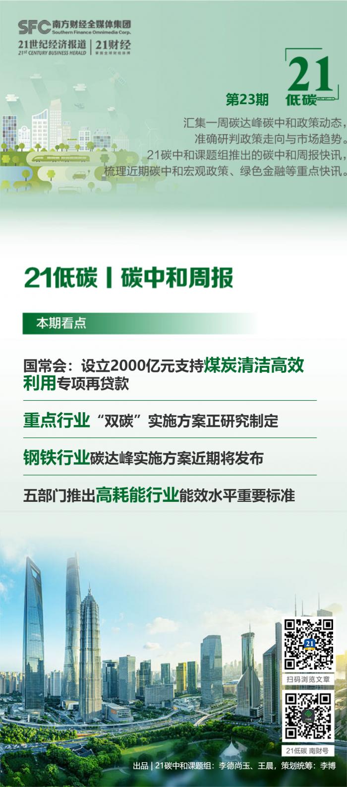本期看点:国常会提出设立2000亿元支持煤炭清洁高效利用专项再贷款;发改委谈碳达峰碳中和后续“1+N”政策体系:正研究制定重点行业实施方案;钢铁行业碳达峰实施方案将于近期发布;五部门推出高耗能行业能效水平重要标准,限期分批改造升级和淘汰。