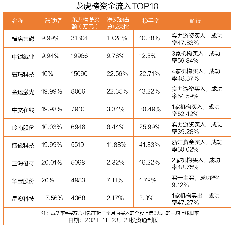 11月23日,上证指数上涨0.2%,深证成指下跌0.37%,创业板指下跌0.37%。盘后龙虎榜数据显示,共有46只个股因当日异动登上龙虎榜,资金净流入最多的是横店东磁(002056.SZ),达3.13亿元。