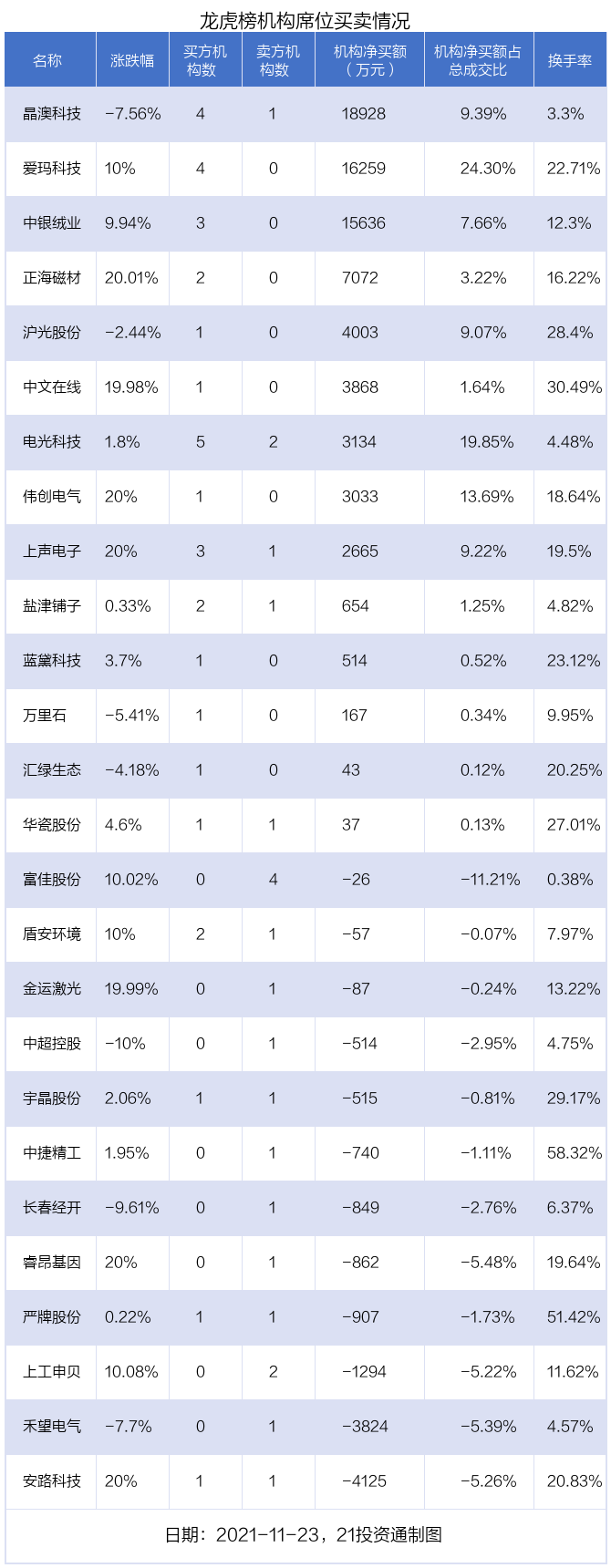 11月23日,26只个股龙虎榜出现了机构的身影,机构合计净买入6.22亿元。具体来看,机构净买入14股,净卖出12股。