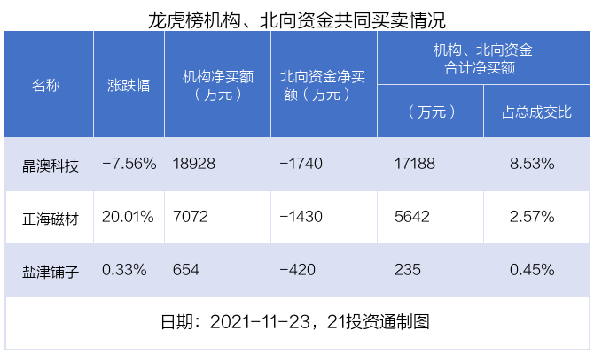 值得注意的是,机构和北向资金在盐津铺子,正海磁材,晶澳科技上出现分歧,机构净买入盐津铺子654.17万元,北向资金净卖出419.64万元;机构净买入正海磁材7072.3万元,北向资金净卖出1429.86万元;机构净买入晶澳科技1.89亿元,北向资金净卖出1739.75万元。