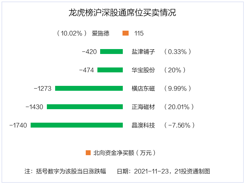 11月23日,北向资金参与龙虎榜中的个股共有6只,合计净卖出5222.1万元。