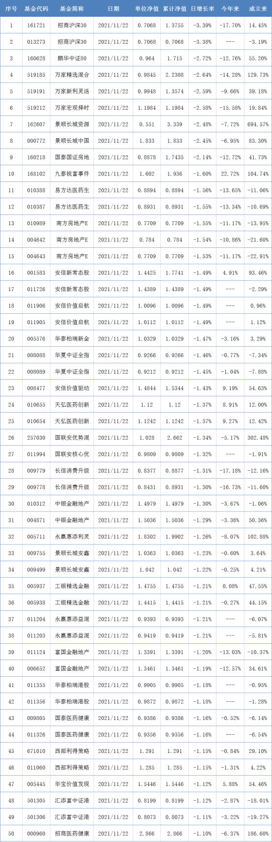 开放式基金净值下跌TOP50: