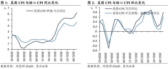 美国通胀30年来最高。美国10月CPI同比增幅6.2%,前值5.4%,为1990年以来最高水平。2021年美国通胀被市场显著低估:2021年1-9月PCE、核心PCE同比为3.3%和2.9%,显著高于2%的通胀目标,也高于2020年预测值:同比均为1.8%。