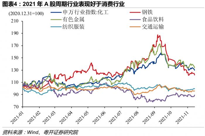 市场原本预期 A 股中消费板块会因需求恢复和业绩改善而有较好表现,但实际上化工、钢铁、有色等周期行业表现显著好于食品饮料、纺织服装、交通运输等消费行业。