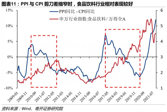 随着国内通胀压力缓解,货币政策和债券股票都将有更大空间。粤开证券认为,随着2022年PPI与CPI剪刀差缩窄,A股中消费板块或将取得更好的相对收益。2022年货币政策将迎来放松的窗口期,10年期国债收益率下行。