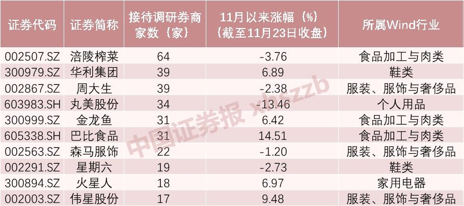 11月以来接待券商调研次数前十的消费股