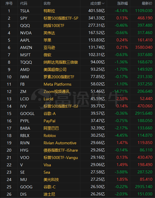 相关推荐 | 美股成交额TOP20:小摩指控特斯拉欠费已提起诉讼