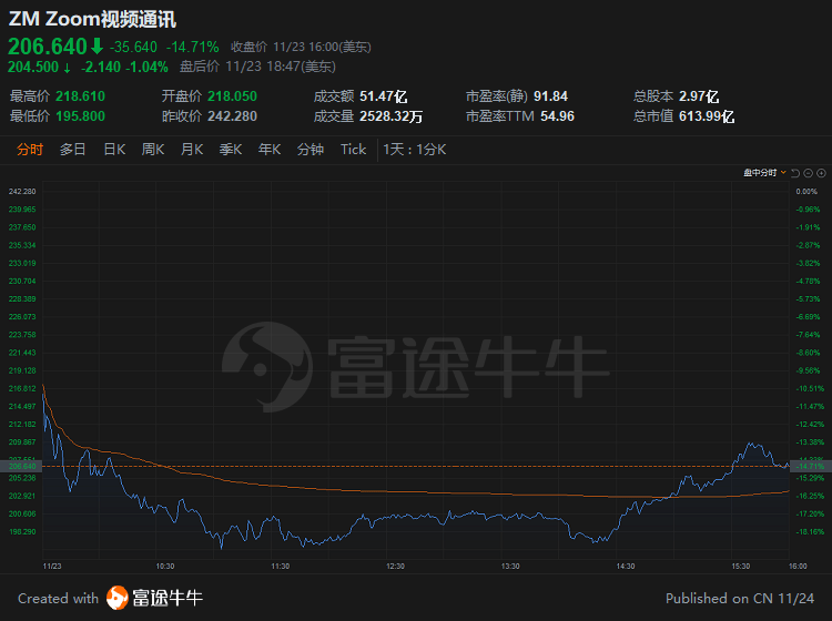 随着周一盘后$Zoom视频通讯(ZM.US)$公布了逊于预期的营收指引,周二包括德意志银行、BTIG均下调了公司的股价预期。受此消息影响,Zoom周二收跌14.71%,报206美元,创下去年六月以来的新低。