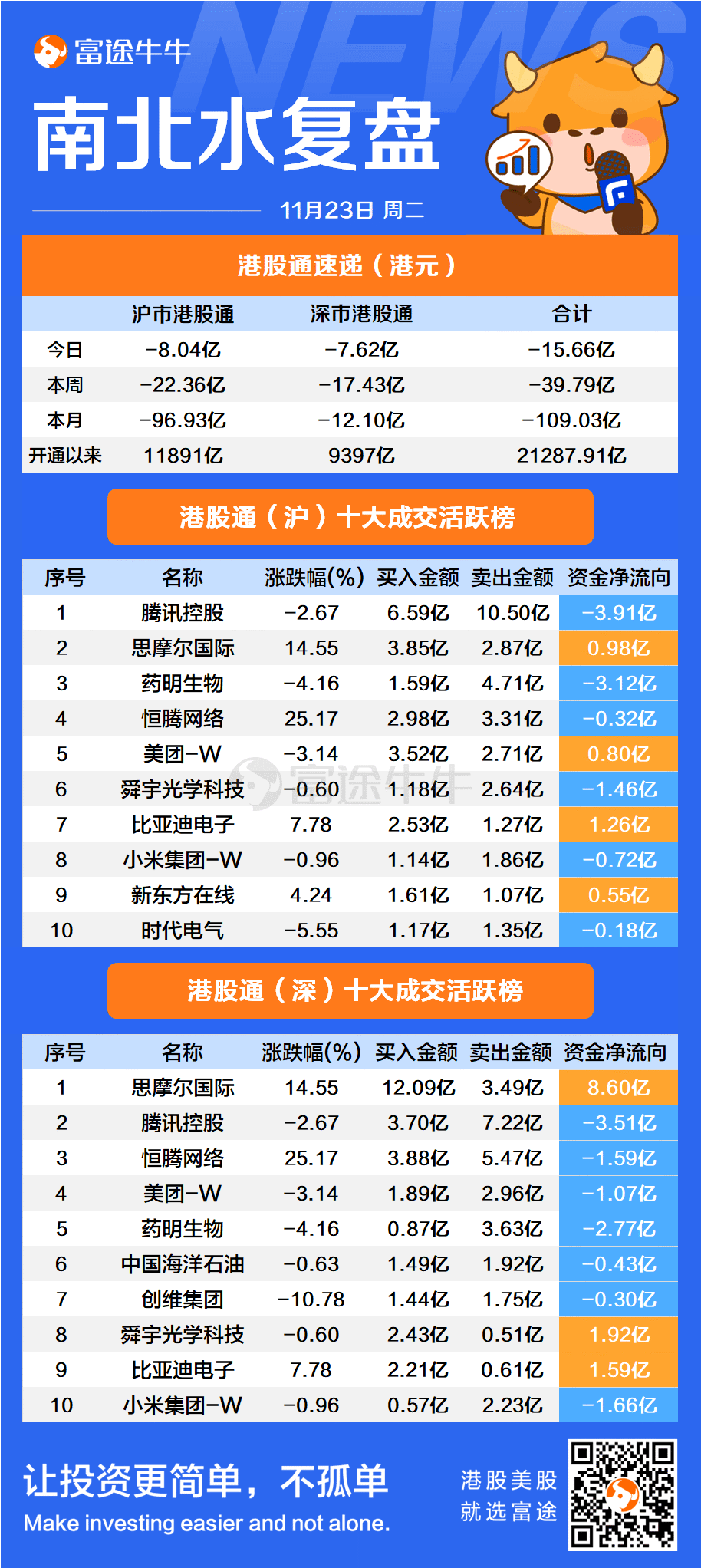 南向资金昨日净卖出15.66亿港元。腾讯控股、药明生物、小米集团-W分别遭净卖出7.42亿港元、5.89亿港元、2.38亿港元;思摩尔国际逆势获净买入9.58亿港元。