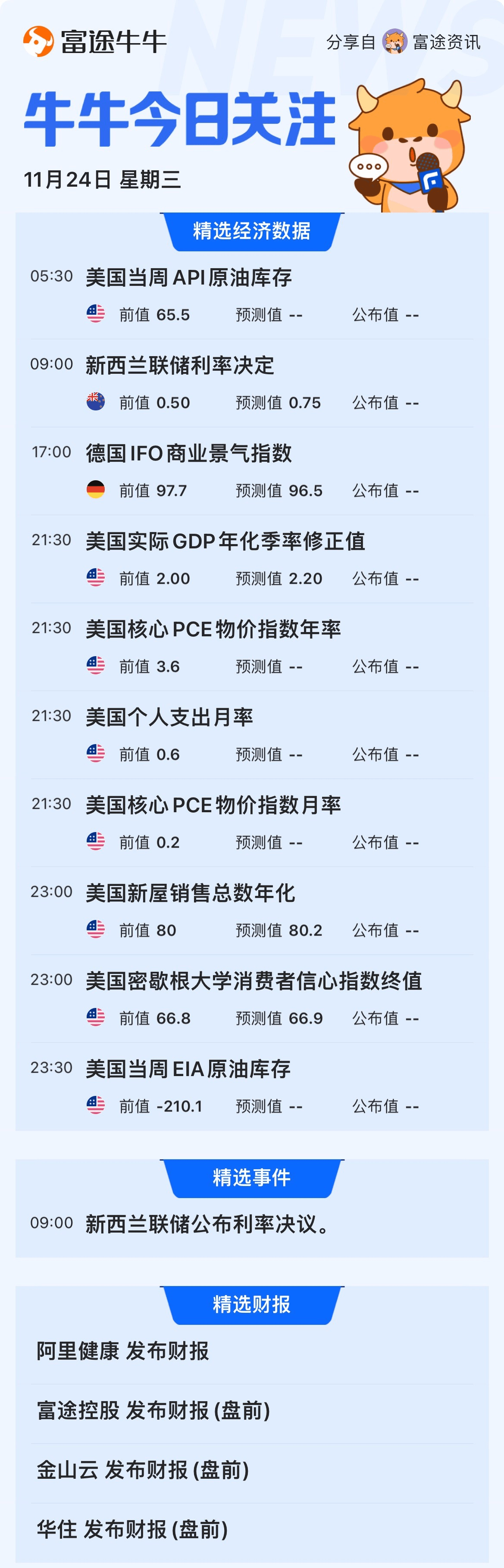 关键词:美国实际GDP年化季率修正值等系列数据,美国当周EIA原油库存,新西兰联储利率决定;富途控股、华住集团、阿里健康等财报重磅来袭