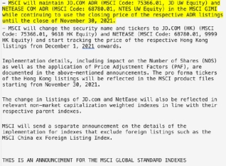 MSCI在11月11日发布公告表示,京东和网易两家公司已满足指数编制的相应要求。MSCI将用其在中国香港上市的股份取代其在美国上市的ADR。MSCI 中国指数和相应的衍生指数均将做出调整。与此同时,MSCI的一些其它相关指数,例如,MSCI中国剔除海外上市股份后指数(MSCI China Ex Foreign Listing Index)也将做出调整。