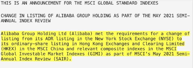 MSCI在5月12日的公告中已表示,将随5月的半年度调整将MSCI旗舰指数和相关衍生指数中的阿里巴巴ADR换成阿里巴巴港股。