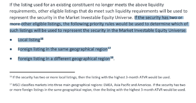 对于中国香港和海外同时上市的股票,按照MSCI的指数编制规则,即便海外上市ADR依然满足MSCI的流动性要求,一旦中国香港上市的股票流动性达到一定的门槛,MSCI就会启动“换股”,将指数中的ADR换成港股。