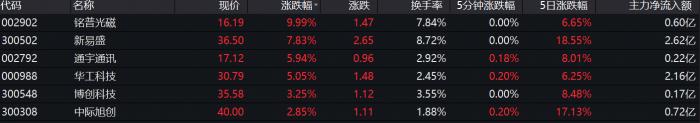 截至11月24日午盘,光模块板块上涨4.11%,从个股上看,铭普光磁上涨9.99%,新易胜上涨7.83%,通宇通讯、华工科技、博创科技、中际旭创均有上涨。