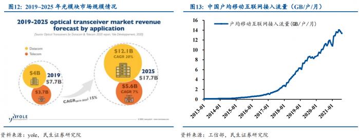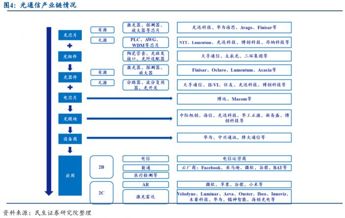民生证券认为,当前,光器件产品正开始向 2B 侧非通信市场(例如医疗检测等领域)渗透,并加速向2C侧消费电子和激光雷达等领域延伸,较之2B市场,2C市场需求更大,产品更新迭代更快,民生证券预计光器件行业即将迎来发展拐点。未来随着这些新兴领域的需求加速放量,将充分打开光器件行业的成长空间。