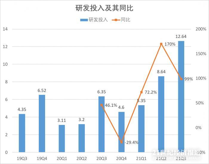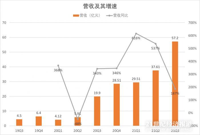 首先来看一下小鹏汽车的营收,财报显示,本季度小鹏汽车共实现营收57.2亿元,其中汽车销售收入为54.6亿元,同比增长187.7%(小鹏汽车首款车型于2018年12月交付,因此未有2018年分季度营收数据,故2019年Q3、Q4部分未有同比显示)。从今年整体数据来看,2021年上半年数据起伏较大是因为2020年新冠肺炎疫情导致了同比基数较低,因此同比涨幅较大;而从环比上来看,则表现较为平稳。