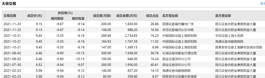 值得注意的是,在跌停前一日(11月23日),国发股份发生两笔共计308万股的大宗交易,成交金额2818.2万元,折价率为9.14%。国发股份近年来的几笔大宗交易,也均是大幅折价“甩卖”。