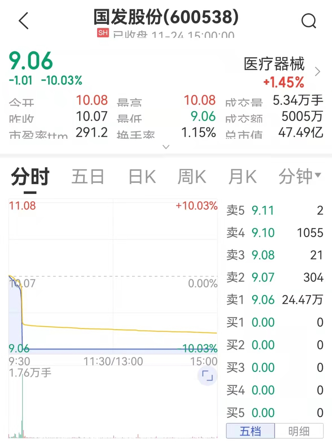 24日开盘后,国发股份一路下挫,大卖单接连堆积,到9点44分16秒,一笔1.76万手的大卖单直接将国发股份钉死在跌停板上。截至收盘,跌停板上仍然挂着近24.5万手卖单。