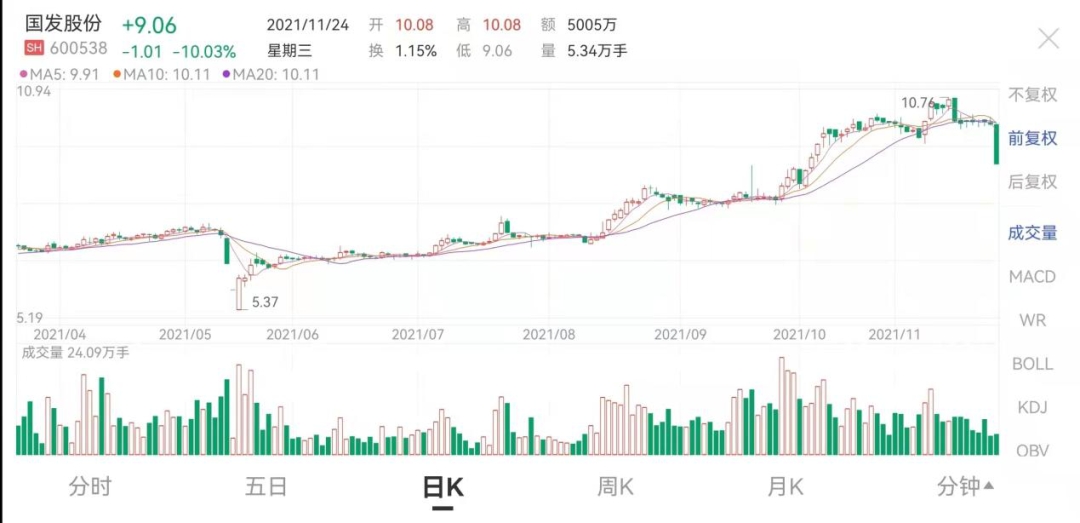 闪崩之后,接着又是一个“一”字跌停。此后,国发股份股价一改颓势,6个月的时间里一路攀升,走出翻倍行情。11月12日,国发股份创出今年以来的新高10.76元/股。