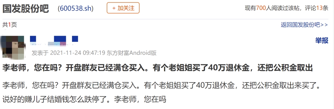 值得注意的是,不少股民在国发股份的股吧里提到了“李老师”。有股民在股吧里发帖喊话“李老师”称,“开盘群友已经满仓买入。有个老姐姐买了40万退休金,还把公积金取出来买了。说好的赚儿子结婚钱,怎么跌停了。”