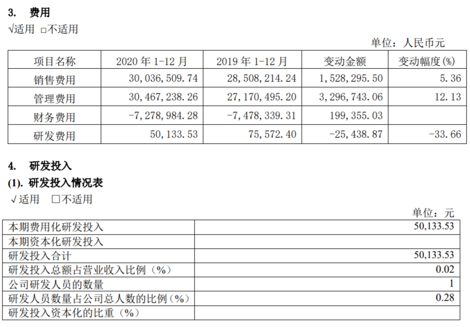 以医药产业、文化酒产业为主营业务的国发股份,2020年的研发投入只有5万元。而公司2017年的研发人员有16人,2018年剩下5人,2019年和2020年仅剩1人。