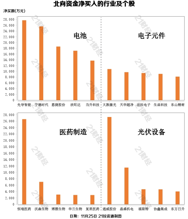 据21投资通(微信号ID:touzit21)智能监测,11月25日,北向资金净买入11.72亿元,其中沪股通净卖出8.66亿元,深股通净买入20.37亿元。北向资金已经连续5日净流入,合计净额为185亿元,期间沪、深股通分别净流入42亿元和143亿元。