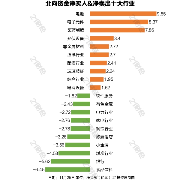 从净买入金额来看,北向资金增持了48个行业,其中电池居首,净买入金额达9.55亿元,其次是电子元件行业,净买入8.37亿元。