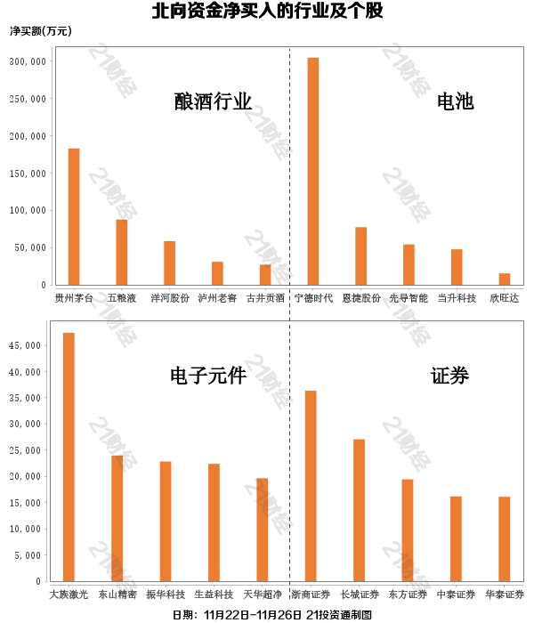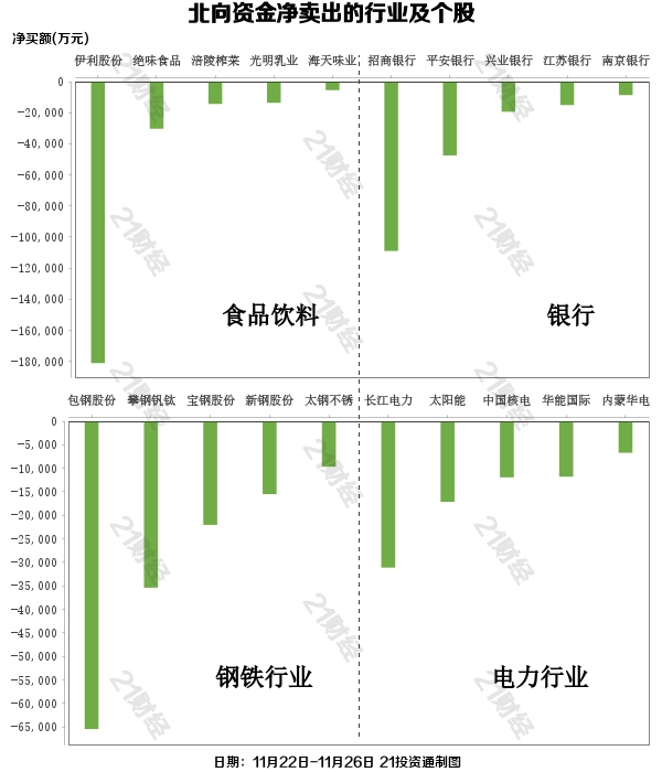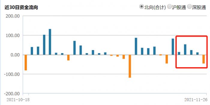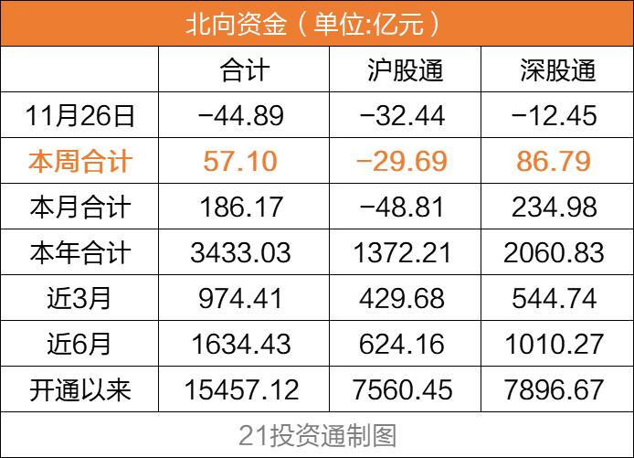 北向资金方面,11月26日全天呈现单边净流出态势,合计净流出44.89亿元,终结了此前的连续五日净流入态势。据21投资通(微信号ID:touzit21)智能监测,过去一周,北向资金累计净买入57.1亿元,其中沪股通净卖出29.69亿元,深股通净买入86.79亿元。
