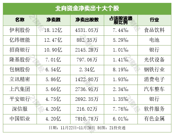 北向资金净卖出额最高的是伊利股份(600887.SH),为18.12亿元。另外,招商银行(600036.SH)被净卖出10.9亿元,隆基股份(601012.SH)被净卖出7.01亿元,包钢股份(600010.SH)被净卖出6.54亿元。
