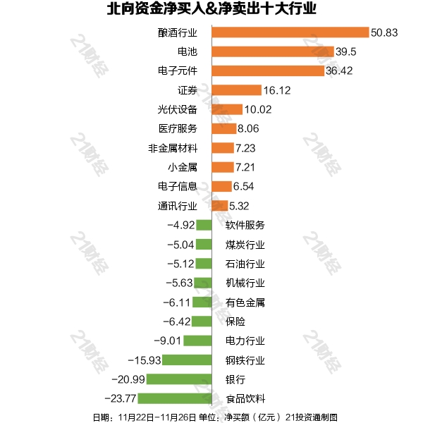 从净买入金额来看,北向资金增持了38个行业,其中酿酒行业居首,净买入金额达50.83亿元,其次是电池行业,净买入39.50亿元。
