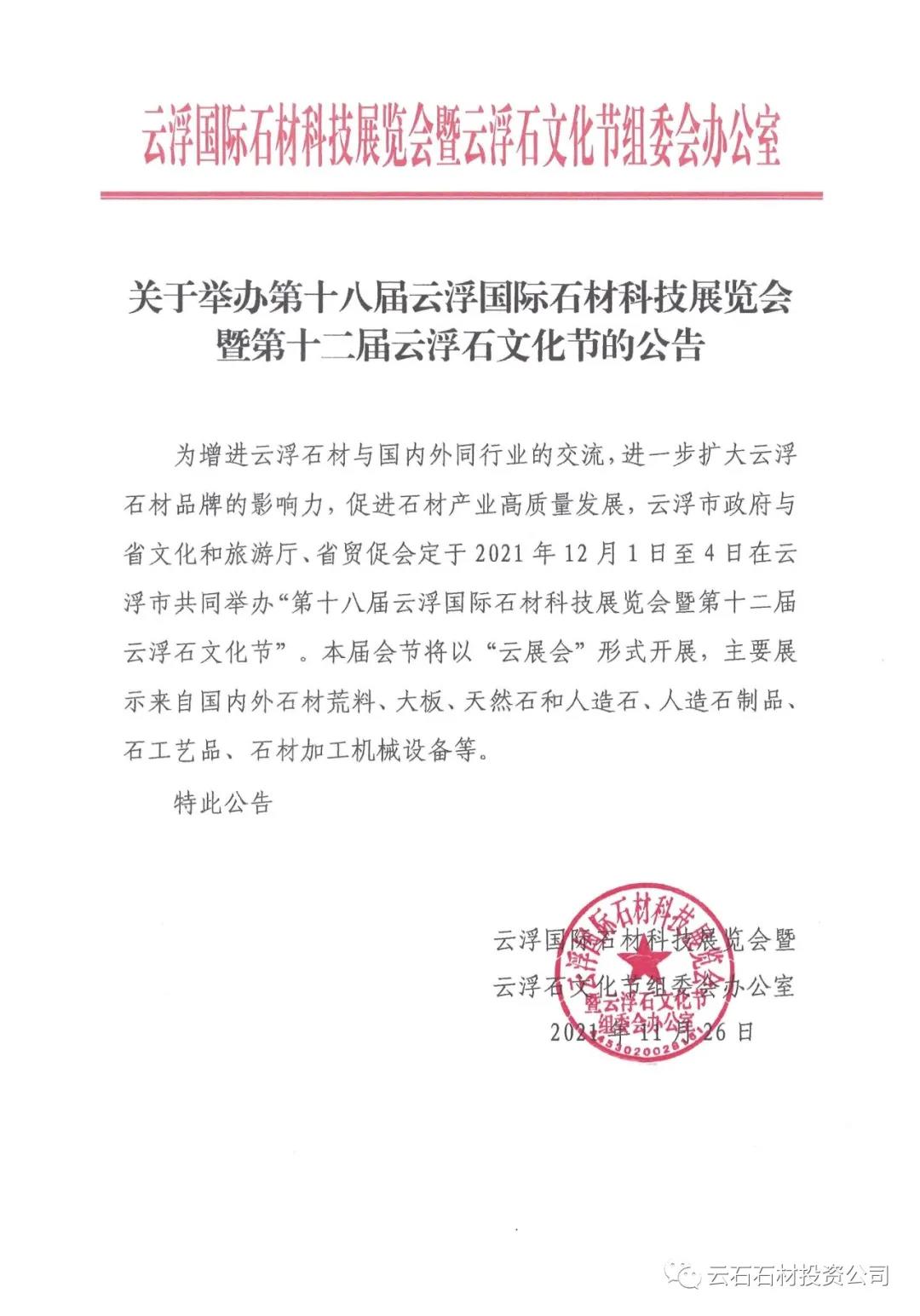 由云浮市人民政府、广东省文化和旅游厅、中国国际贸易促进委员会广东省委员会联合主办的第十八届云浮国际石材科技展览会暨第十二届云浮石文化节,将于2021年12月1日至4日采用线上展览的形式举行。