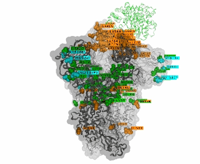 图片显示,与新冠变异病毒德尔塔毒株相比,奥密克戎毒株拥有更多的刺突蛋白突变。这些变异多样化,且大部分位于与人体细胞相互作用的区域。