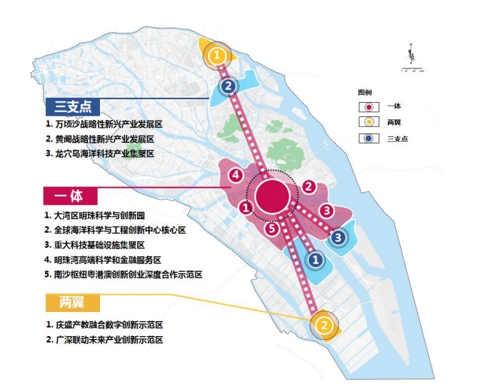“两翼”是指庆盛产教融合数字创新示范区和广深联动未来产业创新示范区。“三支点”是指万顷沙战略性新兴产业发展区、黄阁战略性新兴产业发展区和龙穴岛海洋科技产业发展区。